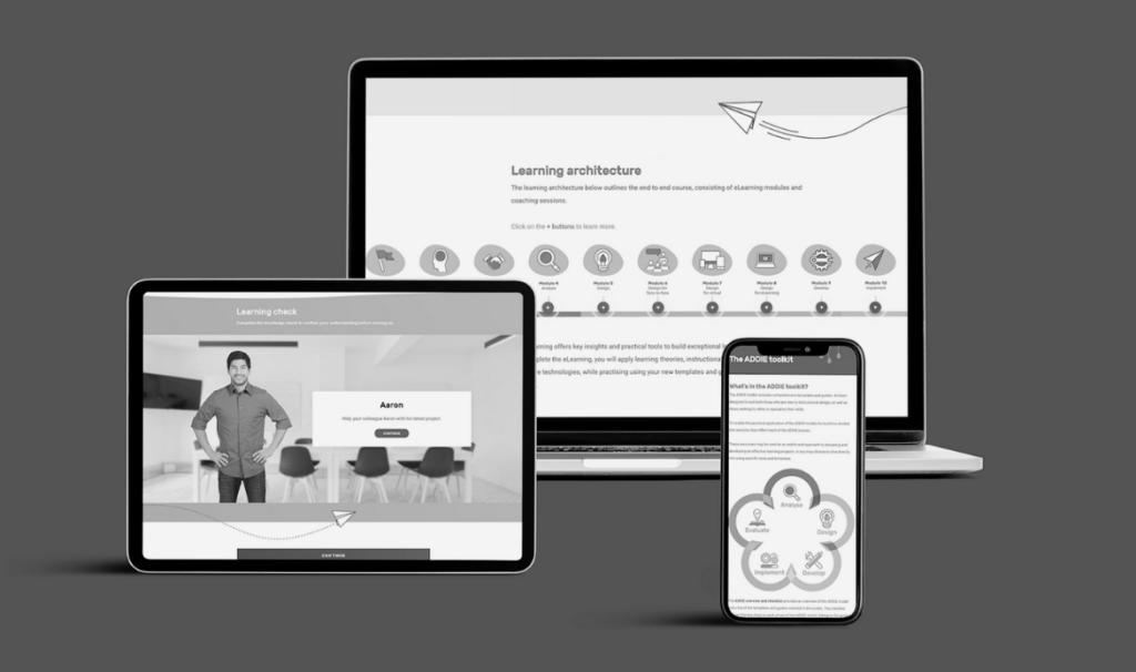 Nous donnerons le coup d’envoi de votre voyage avec notre atelier de lancement interactif. Votre équipe complétera ensuite l’apprentissage en ligne, utilisera la boîte à outils ADDIE, recevra un coaching personnalisé de la part de nos concepteurs pédagogiques seniors et collaborera lors de réunions d’équipe où vous maîtriserez l’art de mettre l’apprentissage en pratique.